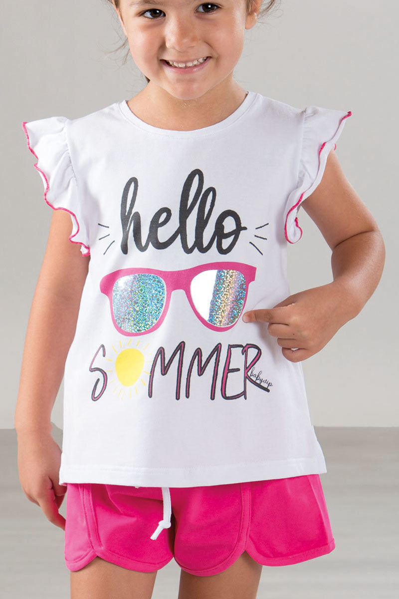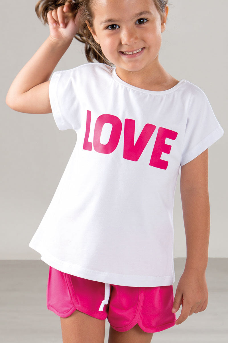 Completo 2 pezzi in cotone organico - Body mezza manica con stampa e bermuda con bretelle in mussola