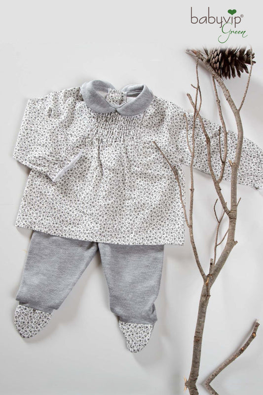 Completo 2 pezzi in cotone organico fantasia floreale con punto smock, maniche a sbuffo ed inserti in caldo cotone organico a contrasto