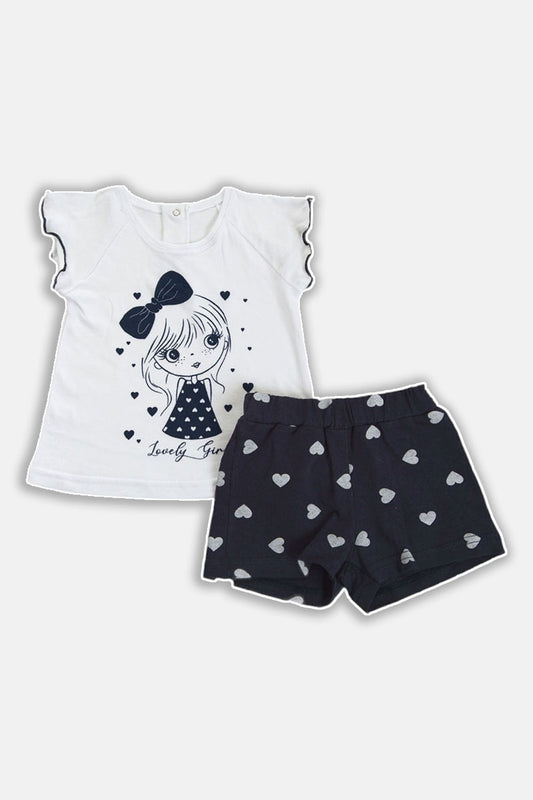 Completo 2 pezzi: t-shirt mezza manica in cotone con stampa, maniche raglan con profilo in contrasto e pantaloncino in cotone elasticizzato fantasia cuori