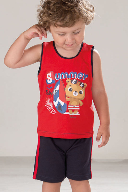 Completo canotta in cotone elasticizzato con stampa e pantaloncino in felpina con risvolti e coulisse in contrasto
