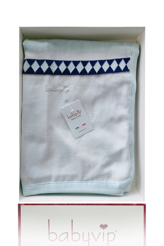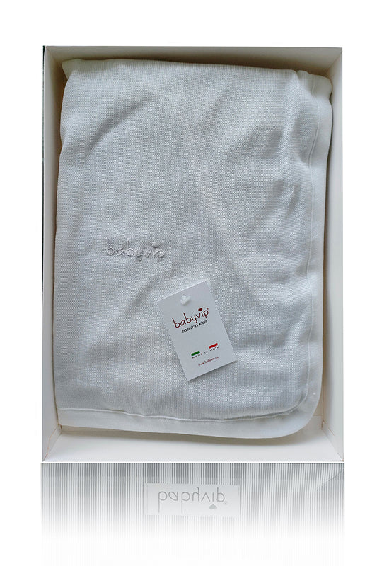 Copertina in piquet con inserto in tela di cotone ricamata, nastro in gros grain con fiocco e applicazione + strass