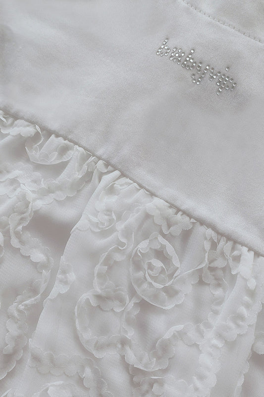 Pagliaccetto in tela e tessuto con fiori applicati con strass