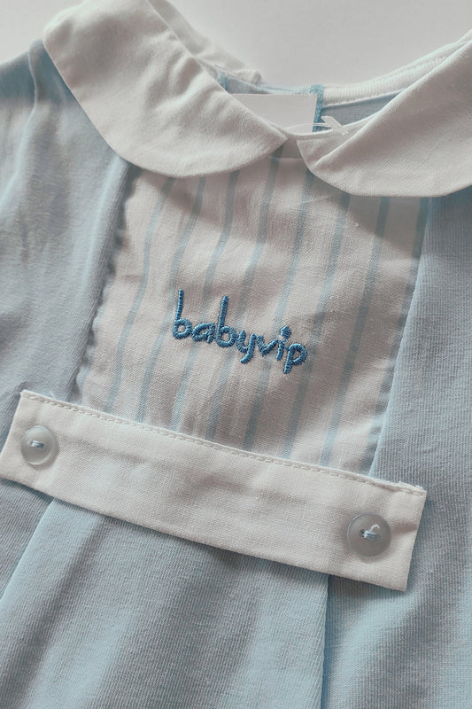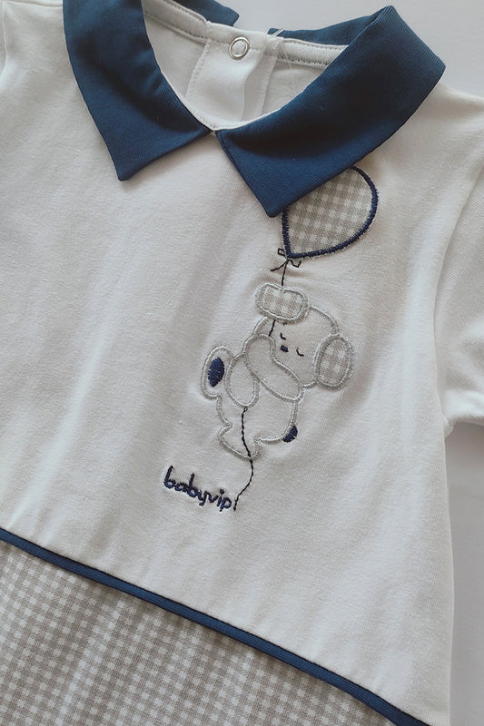 Pagliaccetto mezza manica in cotone elasticizzato con inserti in tela rigata e ricamo babyvip
