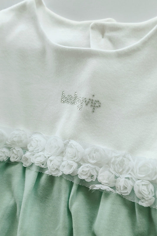 Pagliaccetto spalla larga in cotone makò con nastro applicato con rose in tulle e strass