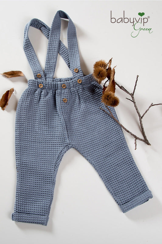 Pantalone con bretelle in cotone organico a nido d’ape con bottoni in contrasto e risvolti sul fondo