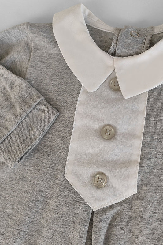Tutina in cotone elasticizzato con gilet doppio petto applicato in tessuto gessato e cravattino