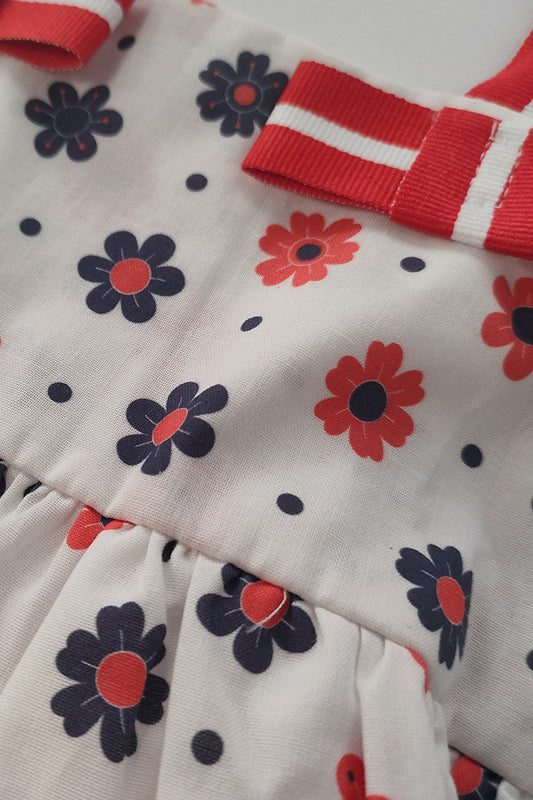 Vestitino in tela di cotone fantasia floreale e inserto in tessuto operato a pois con fiocco e mutandina abbinata