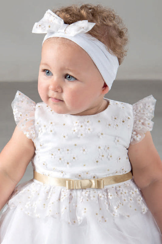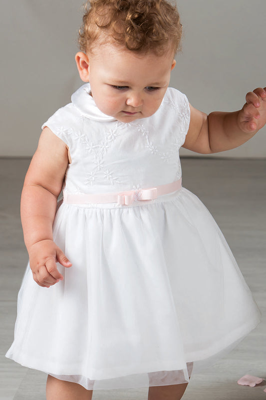 Vestitino in tela di cotone ricamata con colletto in raso, nastro in vita in gros grain con fiore ricamato centrale e tulle sovrapposto + Mutandina in tela di cotone bianca abbinata