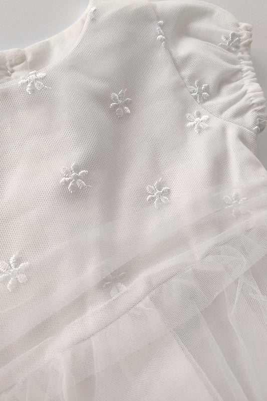 Vestitino in tela di cotone con inserto in tulle ricamato + balze e cintura in tulle annodata sul retro + Mutandina in tela di cotone bianca abbinata