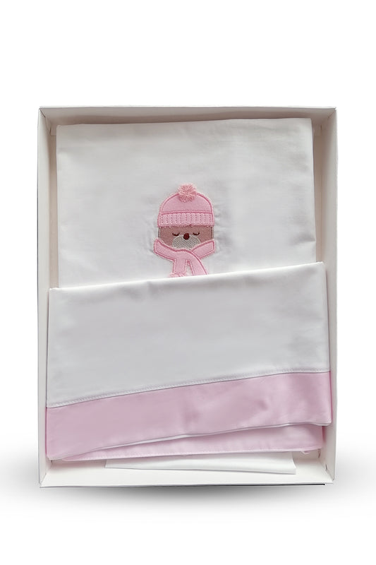 Set lenzuola 3 pezzi per carrozzina e culletta con ricamo orsacchiotto