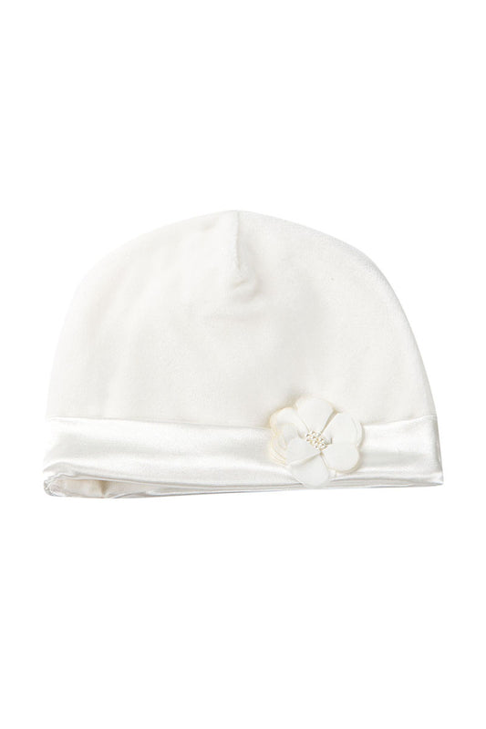 Cappellino in ciniglia con bordo in raso e applicazione