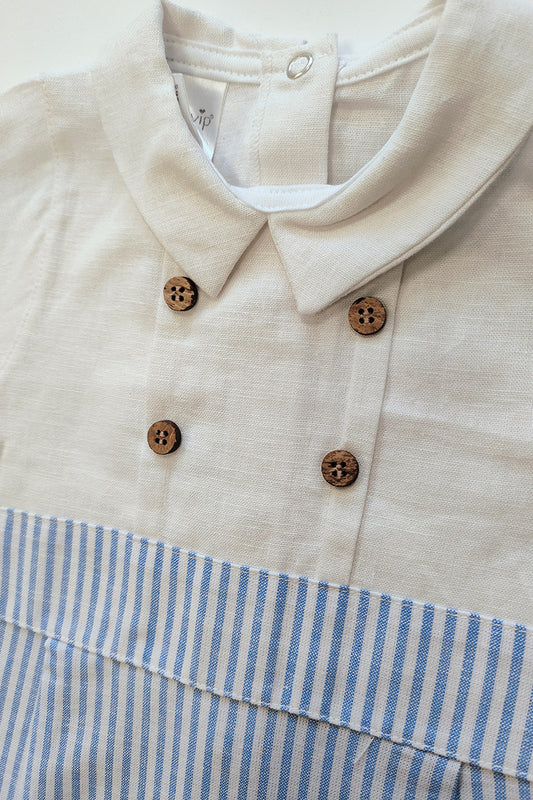 Pagliaccetto in tela di cotone con gilet applicato in tessuto e˜ etto lino e cravattino rigato