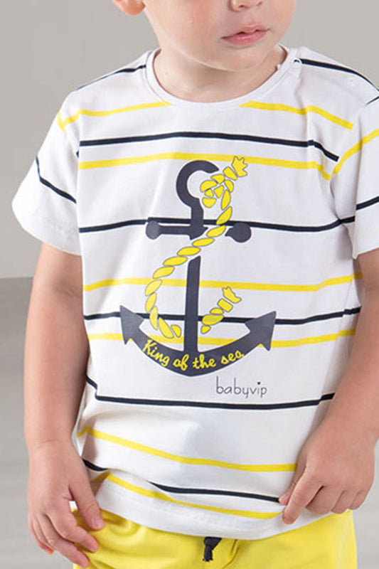 Completo 2 pezzi: T-shirt 100% cotone con stampa e bande su maniche + short in cotone elasticizzato con profilo in contrasto