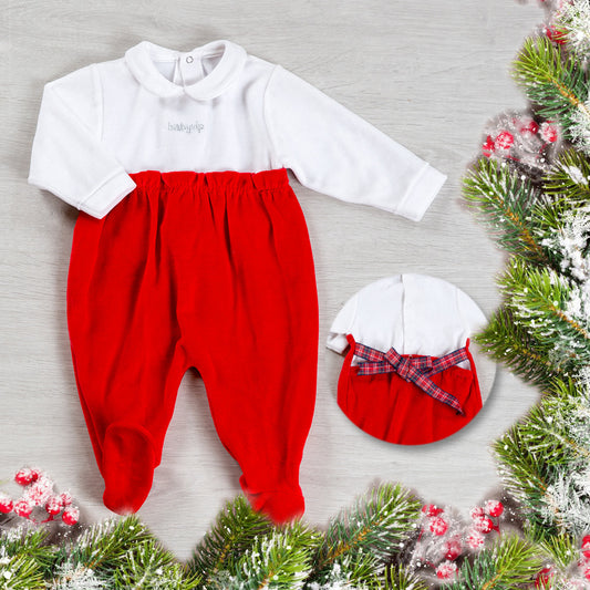 Tutina neonata in ciniglia con ricamo "Piccola Principessa" e nastro in velluto rosso