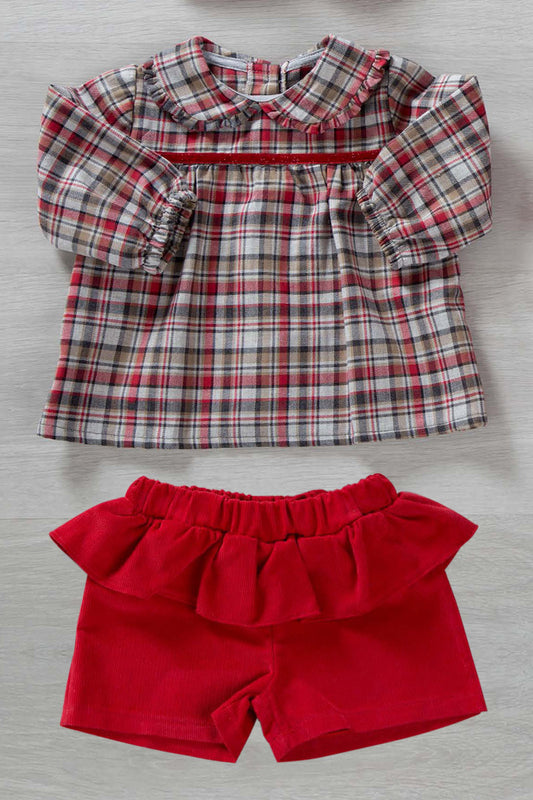 Completo 2 pezzi : camicina in flanella scozzese con colletto + short in vellutino millerighe con balza