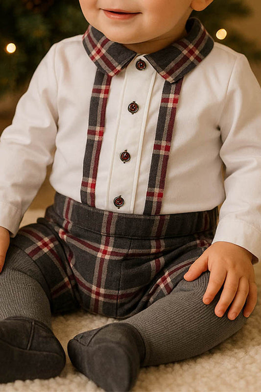 Body a camicia in cotone con colletto, profilo in tessuto scozzese e bottoncini