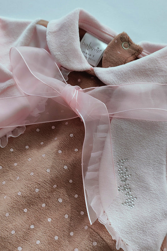Tutina neonata in ciniglia fantasia a pois con fiocco e strass