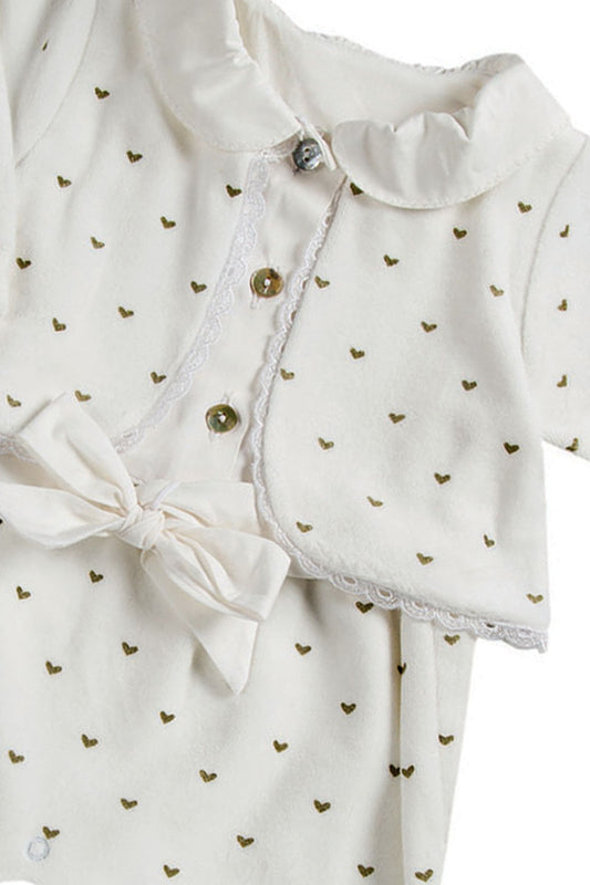 Tutina in in ciniglia fantasia cuori con ricamo, balza e nodini in velluto