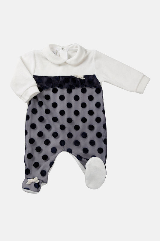 Tutina in ciniglia con inserto in tulle a pois in velluto, balza smerlata e nodino in velluto