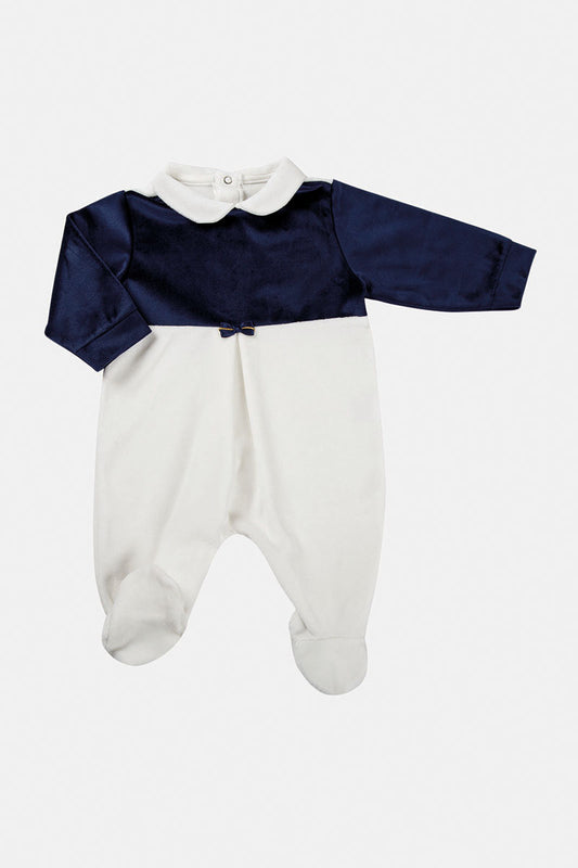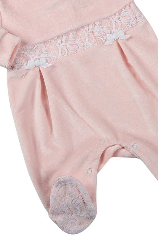 Tutina in ciniglia con inserto in pizzo e nodini in velluto