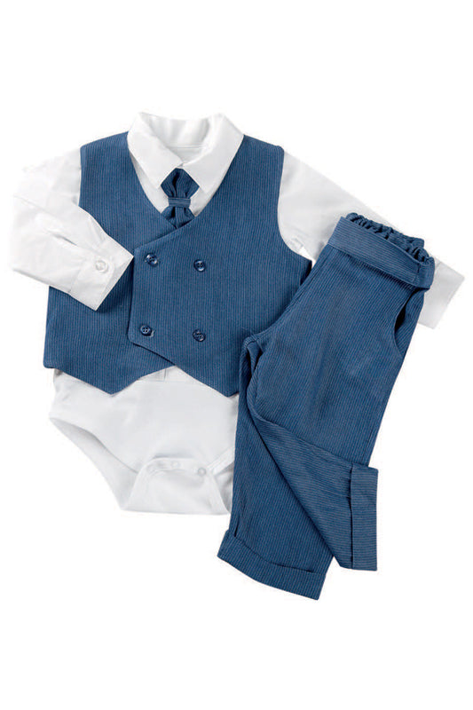 Completo 3 Pezzi: Body a camicia m/l in tela di cotone con cravattino staccabile + gilet doppio petto in tessuto gessato + pantalone con tasche e risvolti