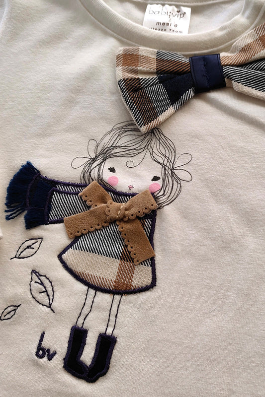 Completo: maglia in cotone elasticizzato garzato con stampa, ricamo, nodino in velluto e leggings fantasia tartan