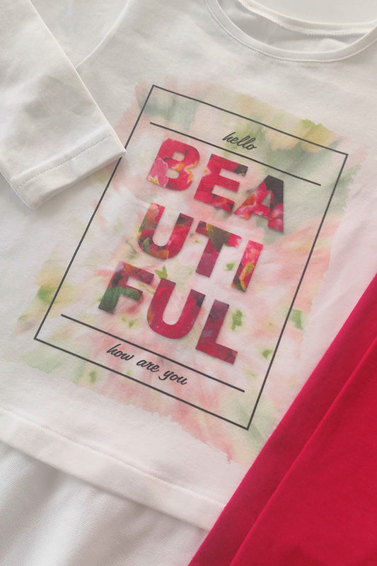 Completo 2 pezzi : T-shirt manica lunga in cotone elasticizzato con stampa e strass + leggings in contrasto