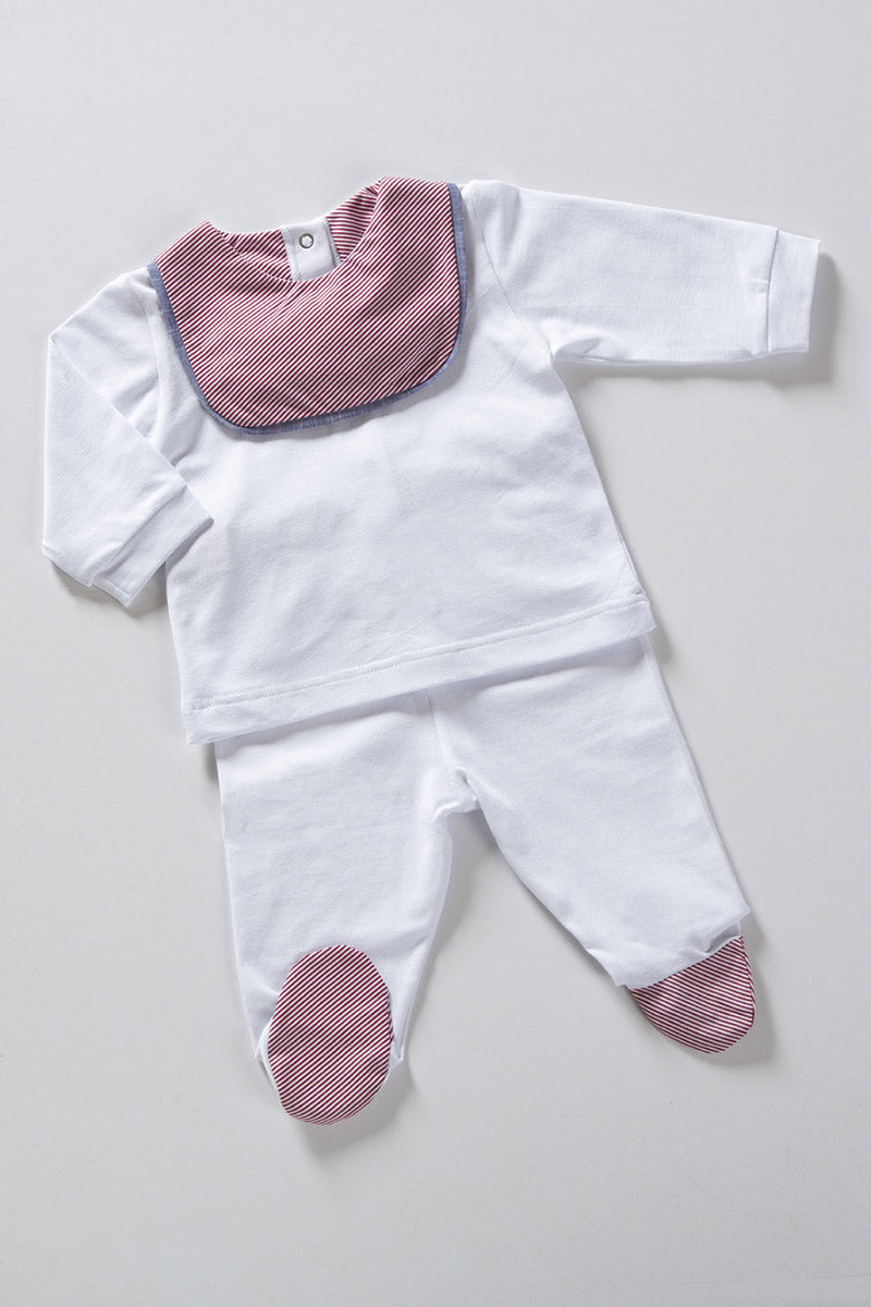 Completo 2 pezzi in cotone elasticizzato con collo alla marinara in tela di cotone rigato e profilo in contrasto