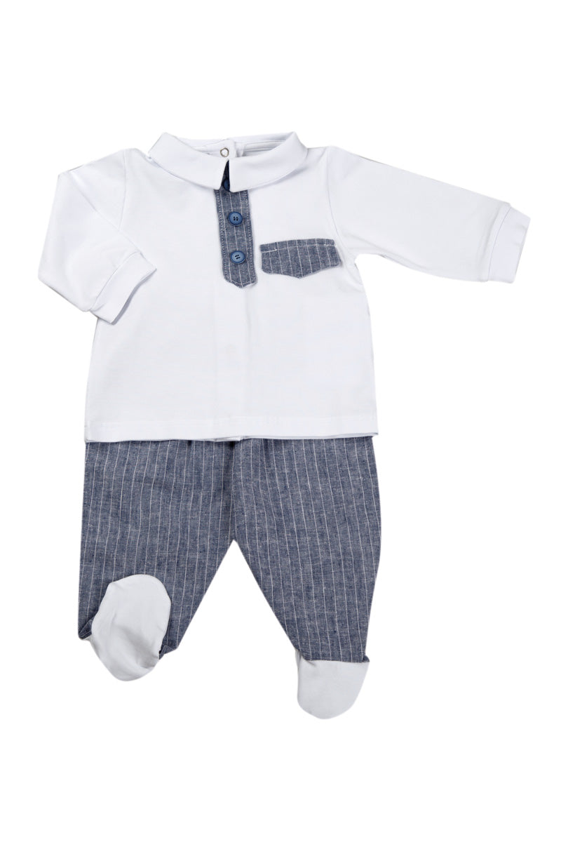 Completo 2 pezzi con inserti in tela effetto lino rigato.