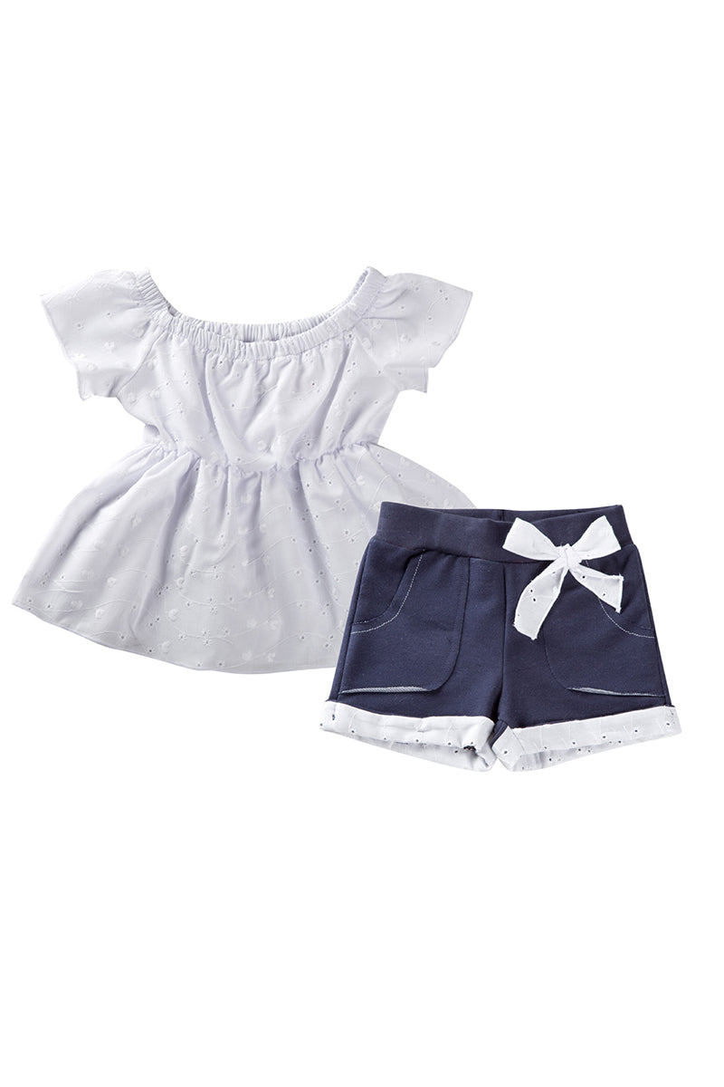 Completo 2 pezzi con top in tela sangallo più shots in jeans elasticizzato con inserti in sangallo