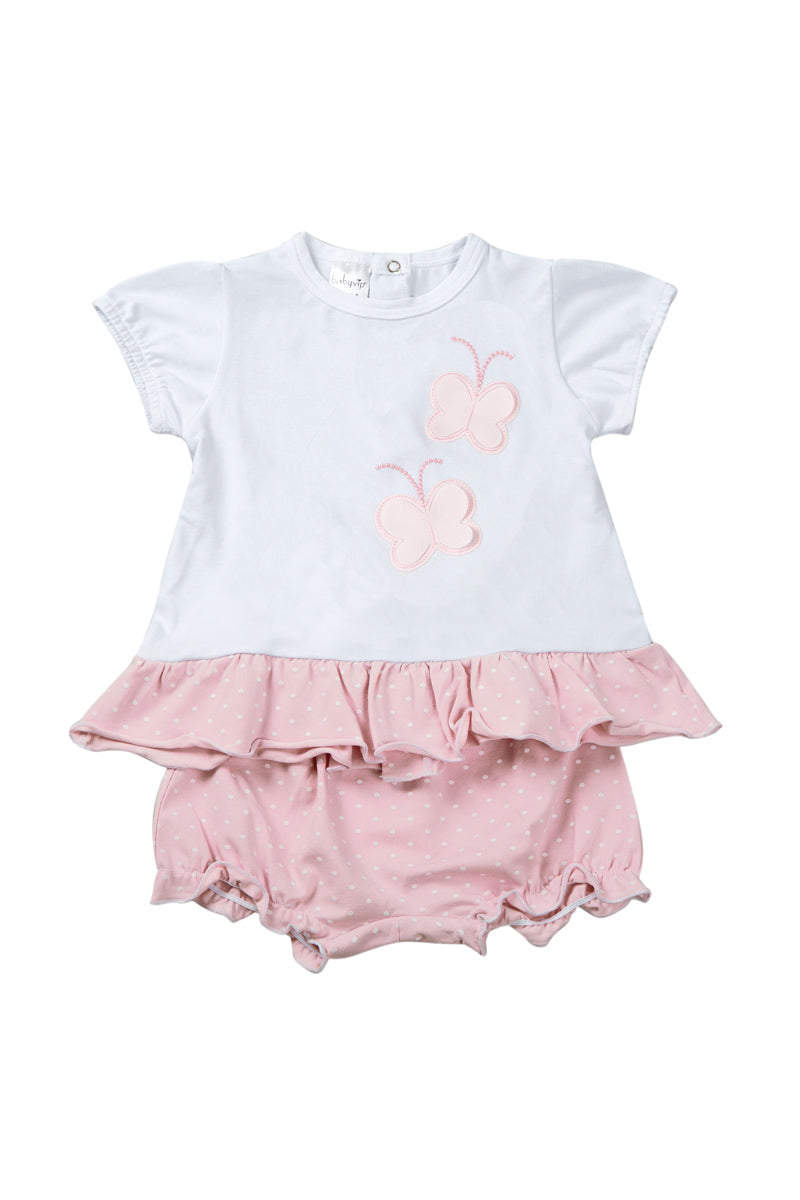 Completo 2 pezzi con ricamo farfalle e inserti a pois