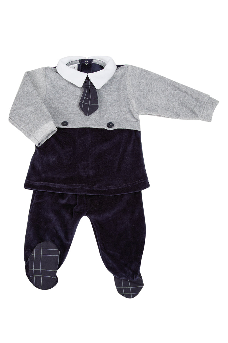 Completo 2 pezzi in ciniglia con cravattino e inserti in felpa pied de poule