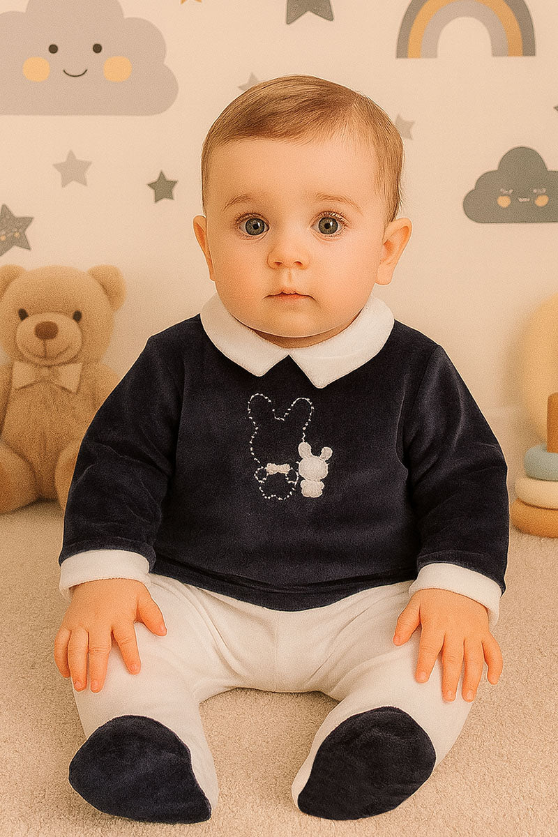Completo 2 pezzi in ciniglia con ricamo ed inserti in contrasto
