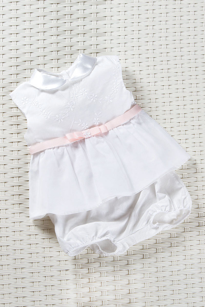 Completo 2 pezzi in tela di cotone ricamata con nastro in gros grain, fiocco e inserto in tulle sovrapposto