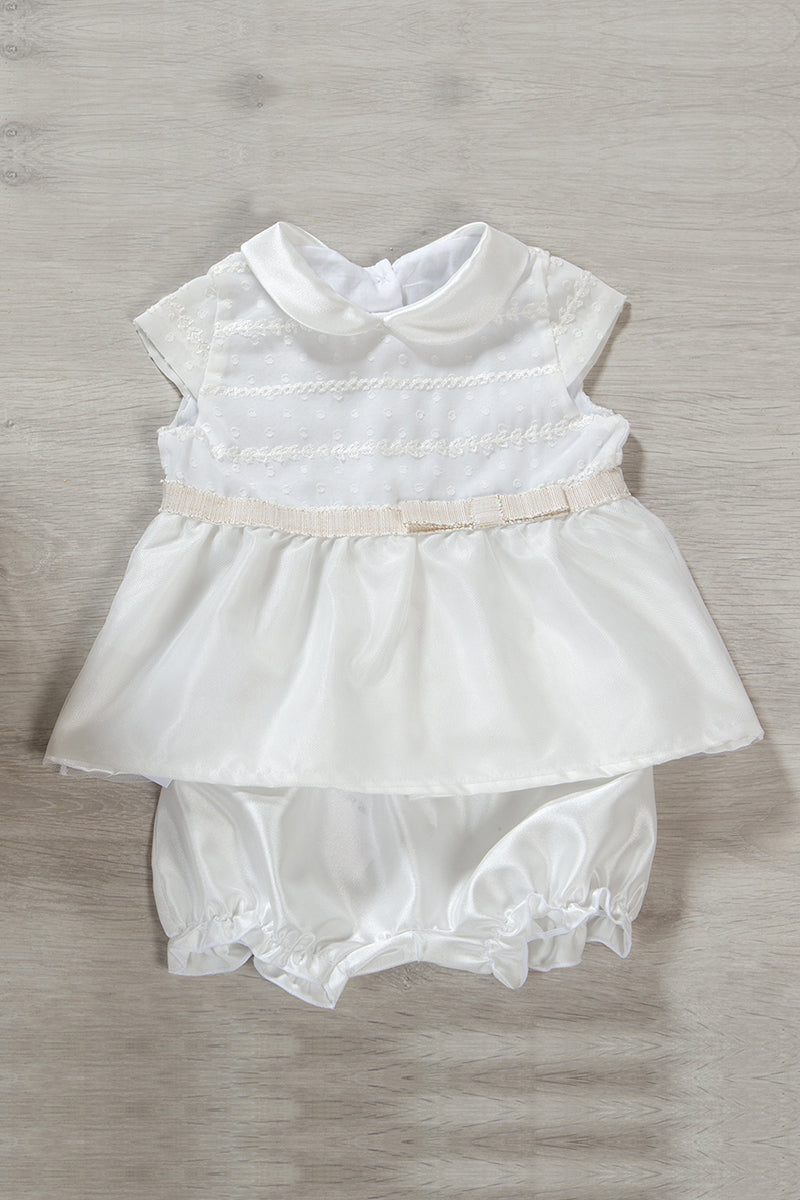 Completo 2 pezzi in raso con inserto in tessuto ricamato in rilievo, nastro in gros grain con fli in oro, taglio con arricciatura e tulle sovrapposto
