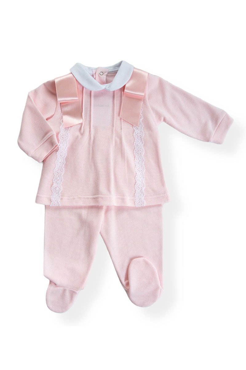 Completo 2 pezzi in piquet con pieghette, pizzo applicato e fiocchi in raso su spalla