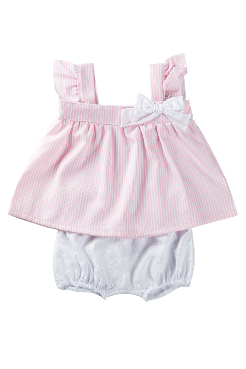 Completo 2 pezzi in tela navetta rigata con balze, fiocco e pantaloncino in tela sangallo