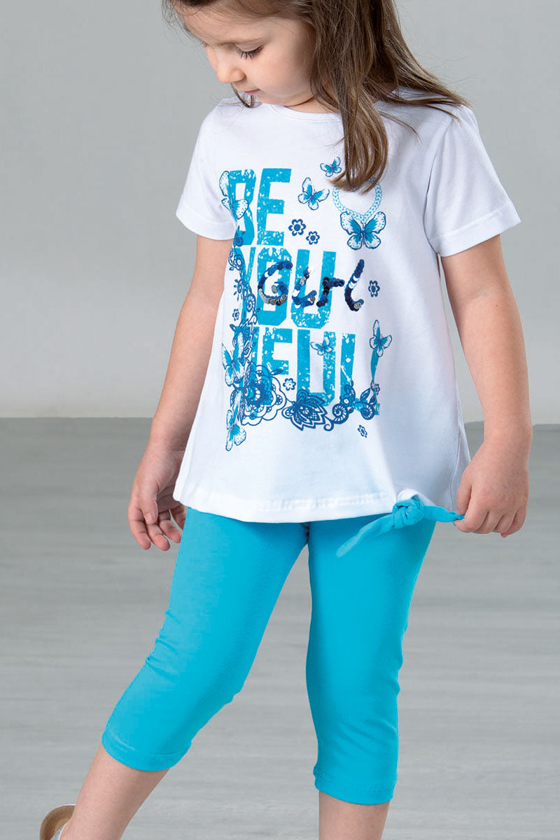 Completo in cotone elasticizzato con stampa, paillettes ricamate, nodo sul fondo e pinocchietto in contrasto