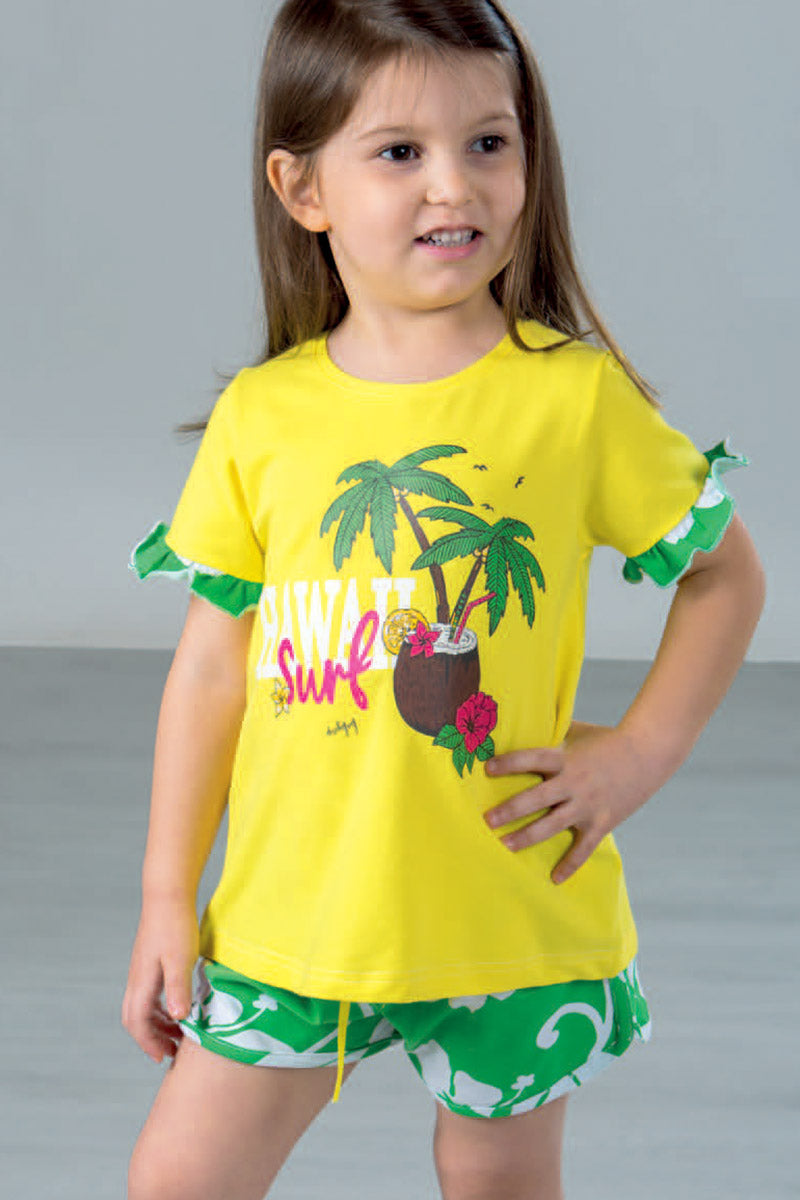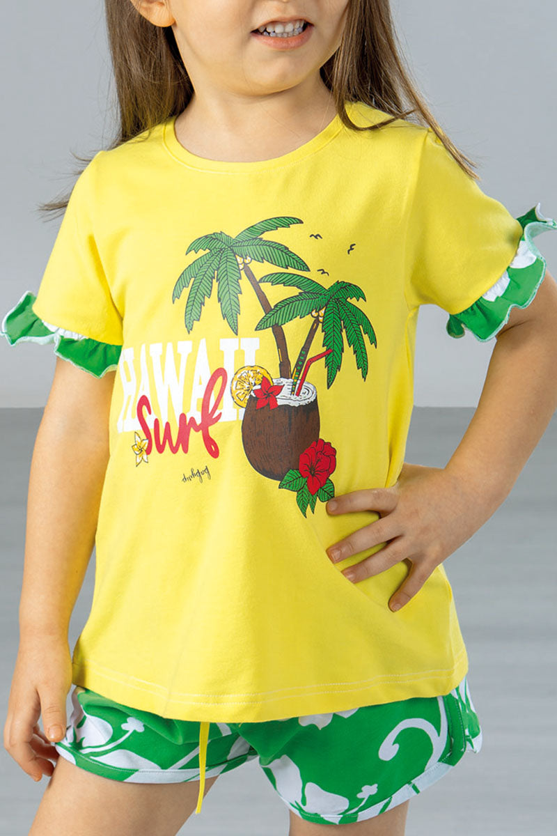 Completo in cotone elasticizzato con stampa rouches fondo manica e pantaloncino fantasia con coulisse in contrasto
