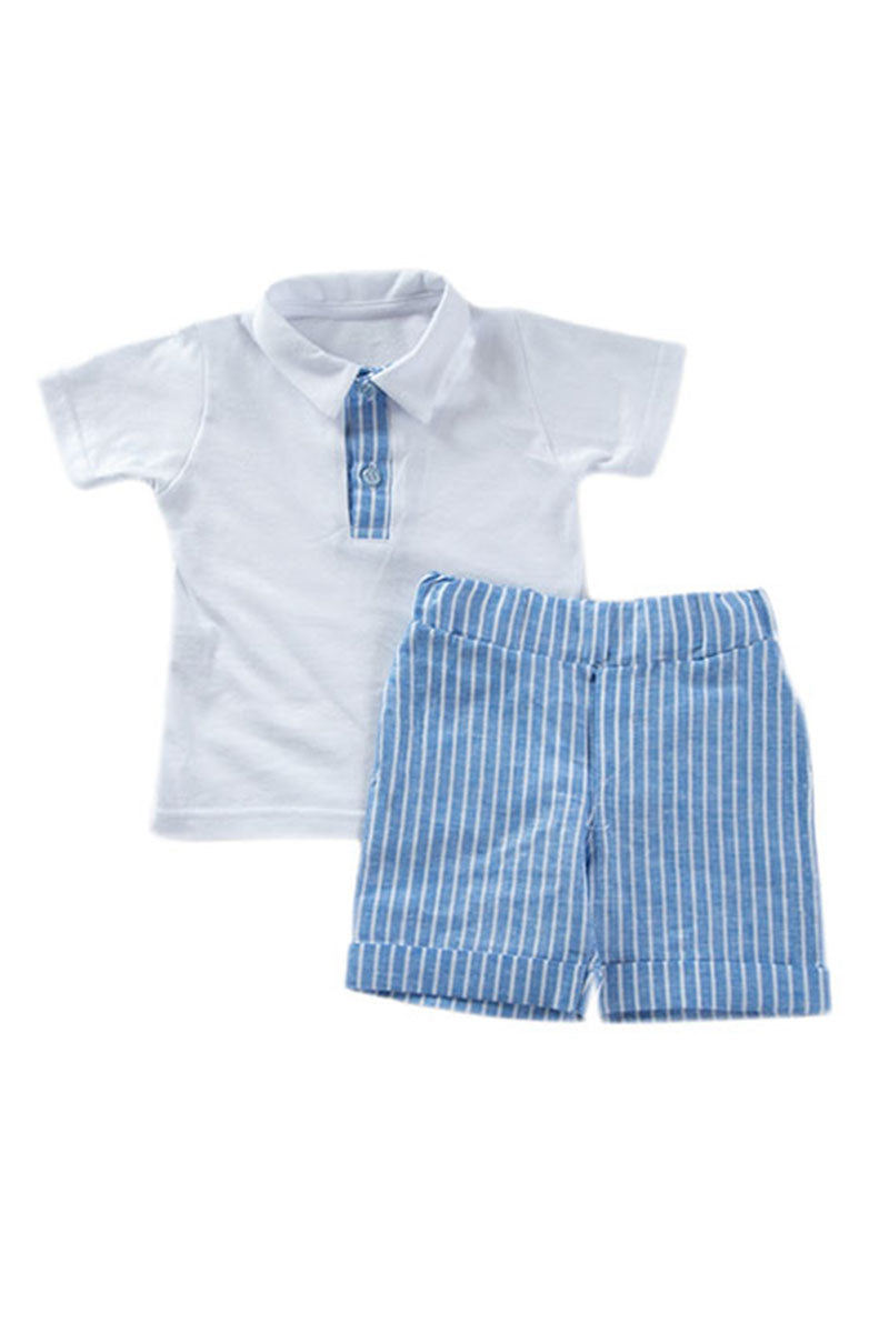 Completo 2 pezzi : Polo in cotone con fenda rigata + Bermuda in tela effetto lino rigato con risvolto sul fondo