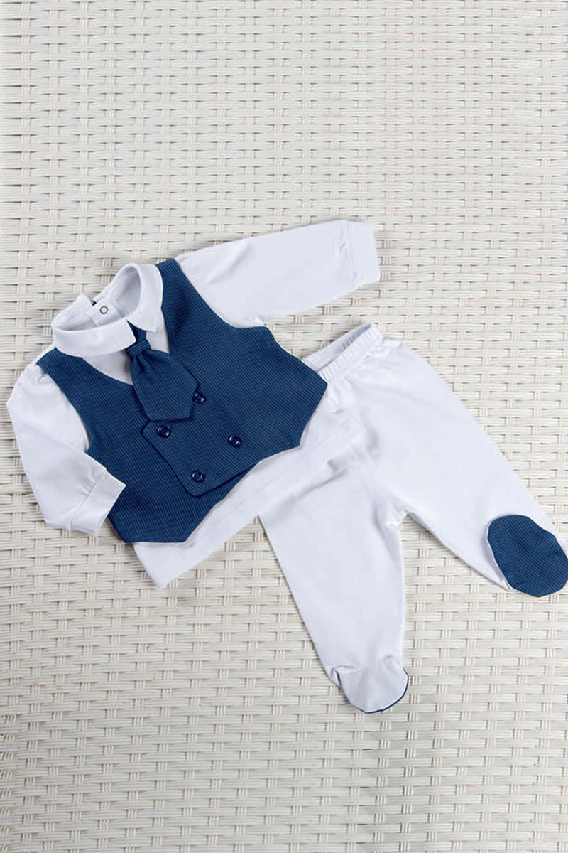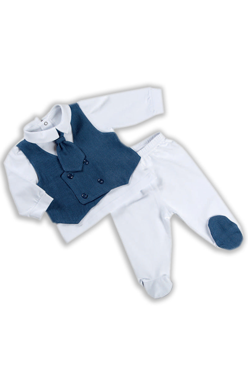 Completo in cotone elasticizzato con gilet doppio petto applicato in tessuto gessato e cravattino