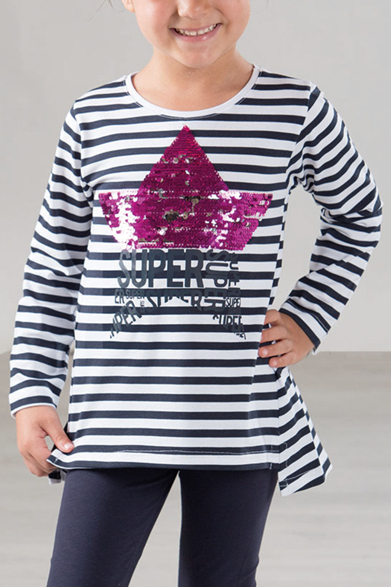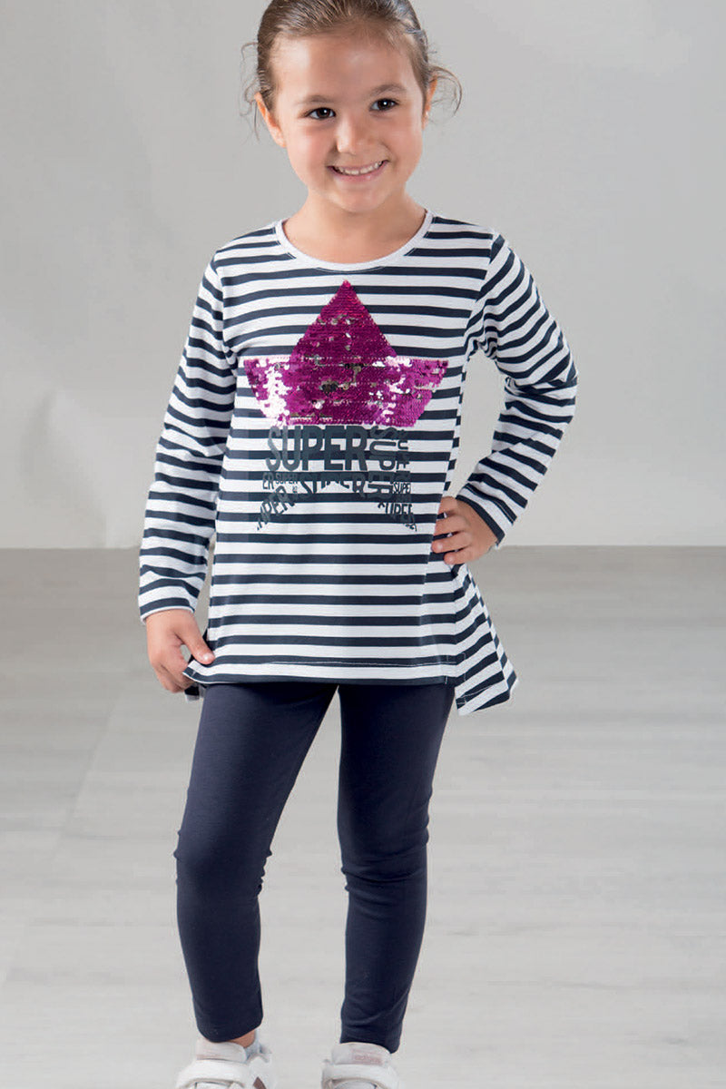 Completo manica lunga in cotone elasticizzato con maglia rigata, stampa con paillettes reversibili e spacchi sul fondo e leggings in contrasto