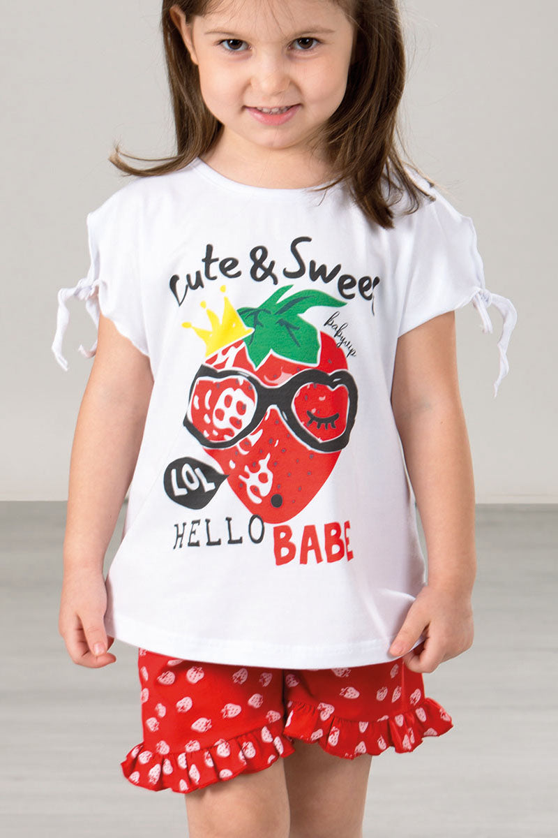 Completo in cotone elasticizzato con stampa, nodi sulle maniche e short fantasia fragoline con rouches sul fondo