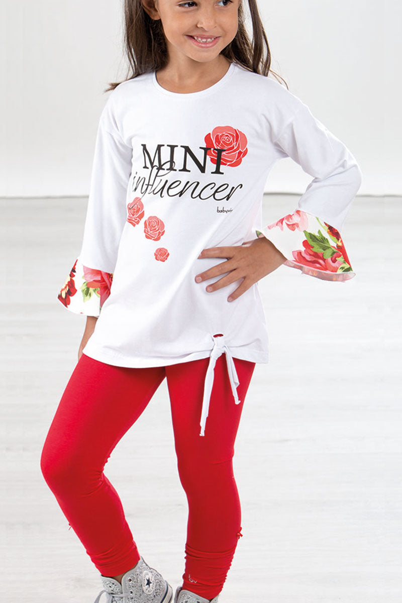 Completo 2 pezzi in cotone elasticizzato con stampa, balze fondo manica in crepe fantasia floreale e laccio annodato sul fondo