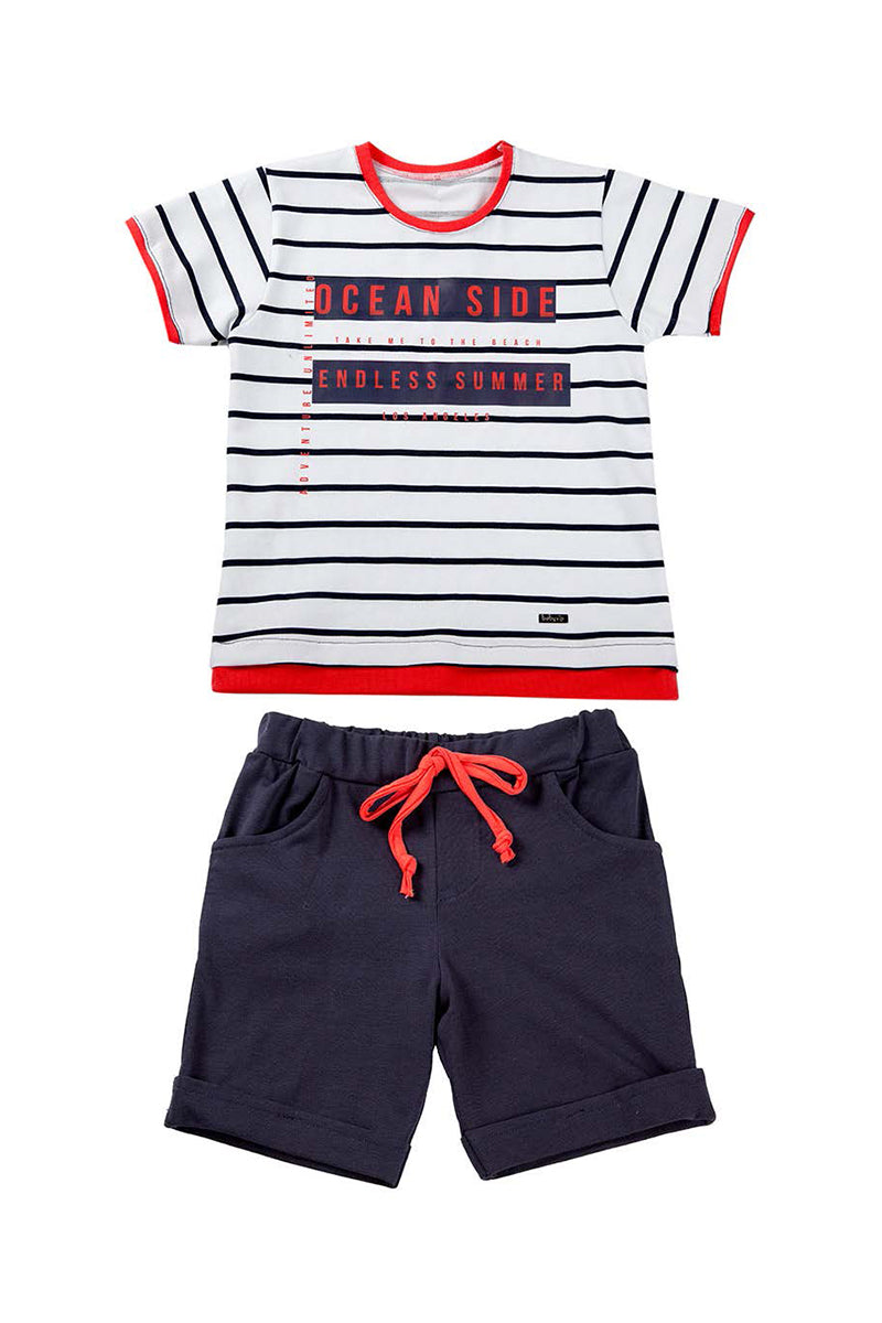 Completo mezza manica in cotone elasticizzato rigato con stampa e profili in contrasto