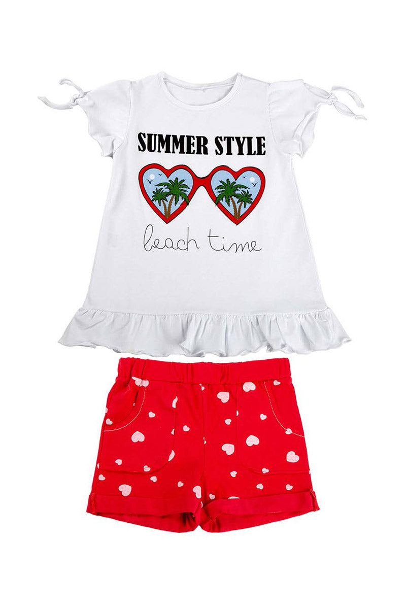 Completo mezza manica in cotone elasticizzato con stampa, balza e shorts fantasia cuori con tasche e risvolti