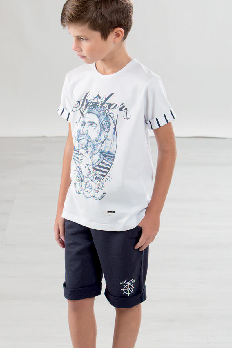 Completo mezza manica con bermuda in cotone elasticizzato rigato con stampe e risvolti