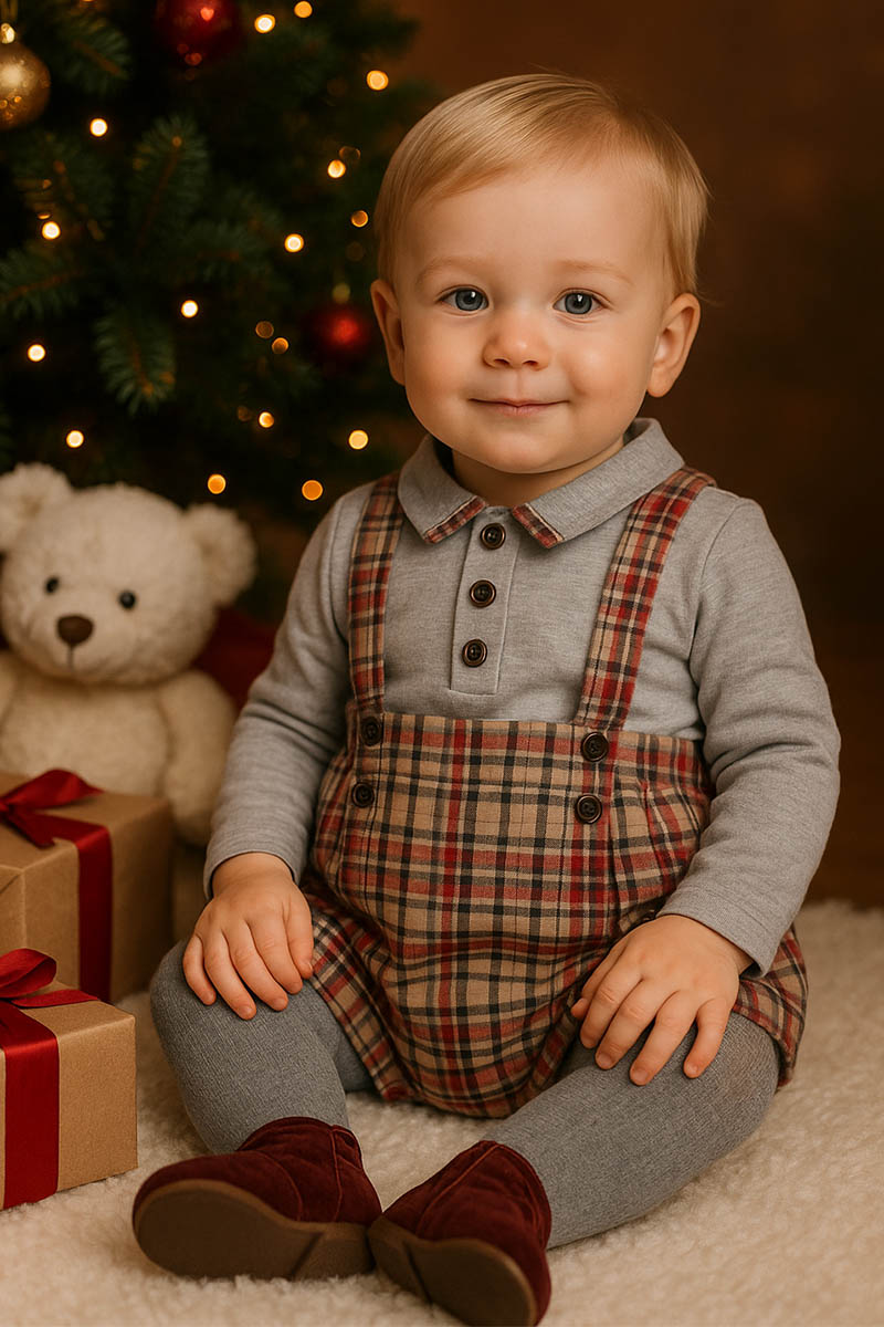 Salopette a pantaloncino in flanella scozzese con bottoni applicati
