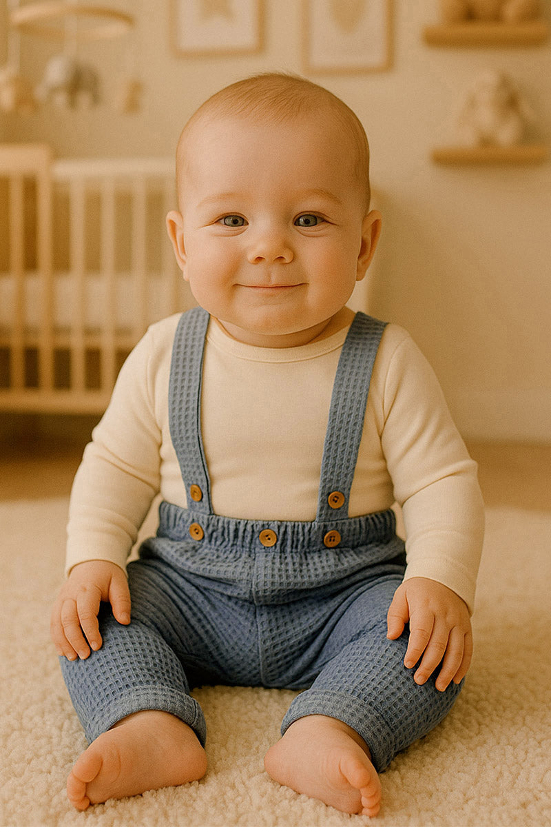 Pantalone con bretelle in cotone organico a nido d’ape con bottoni in contrasto e risvolti sul fondo