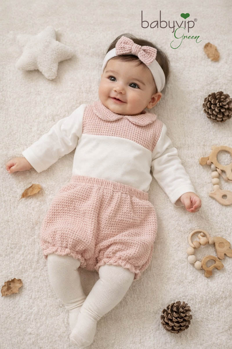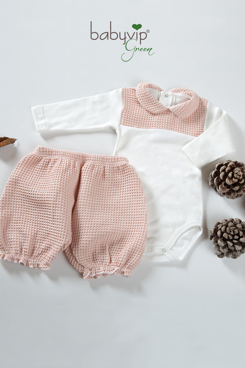 Completo 2 pezzi : Body in caldo cotone organico con colletto a nido d’ape + Pantaloncino a palloncino a nido d’ape in cotone organico